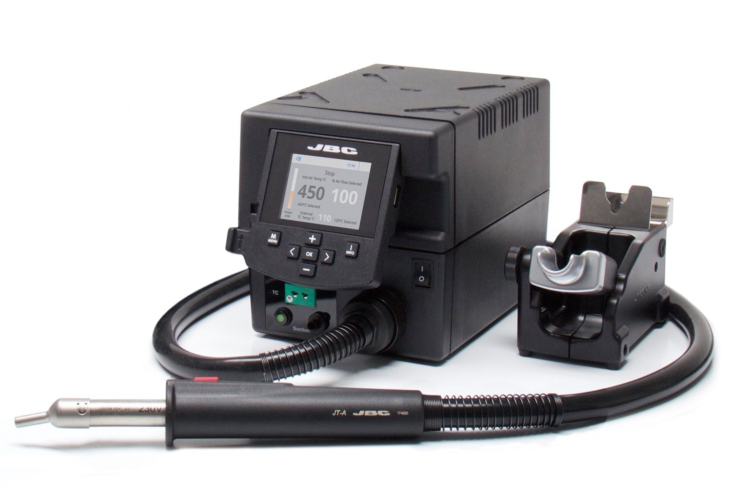 Stație de aer cald, JBC TOOLS, JBC-JTSE-2QB, alegerea ideală pentru profesioniști și pasionați de electronică. Fiabila, precisa și ușor de utilizat, această stație combină funcționalitățile într-un singur dispozitiv, ideal pentru reparații electronice, întreținere și producție.