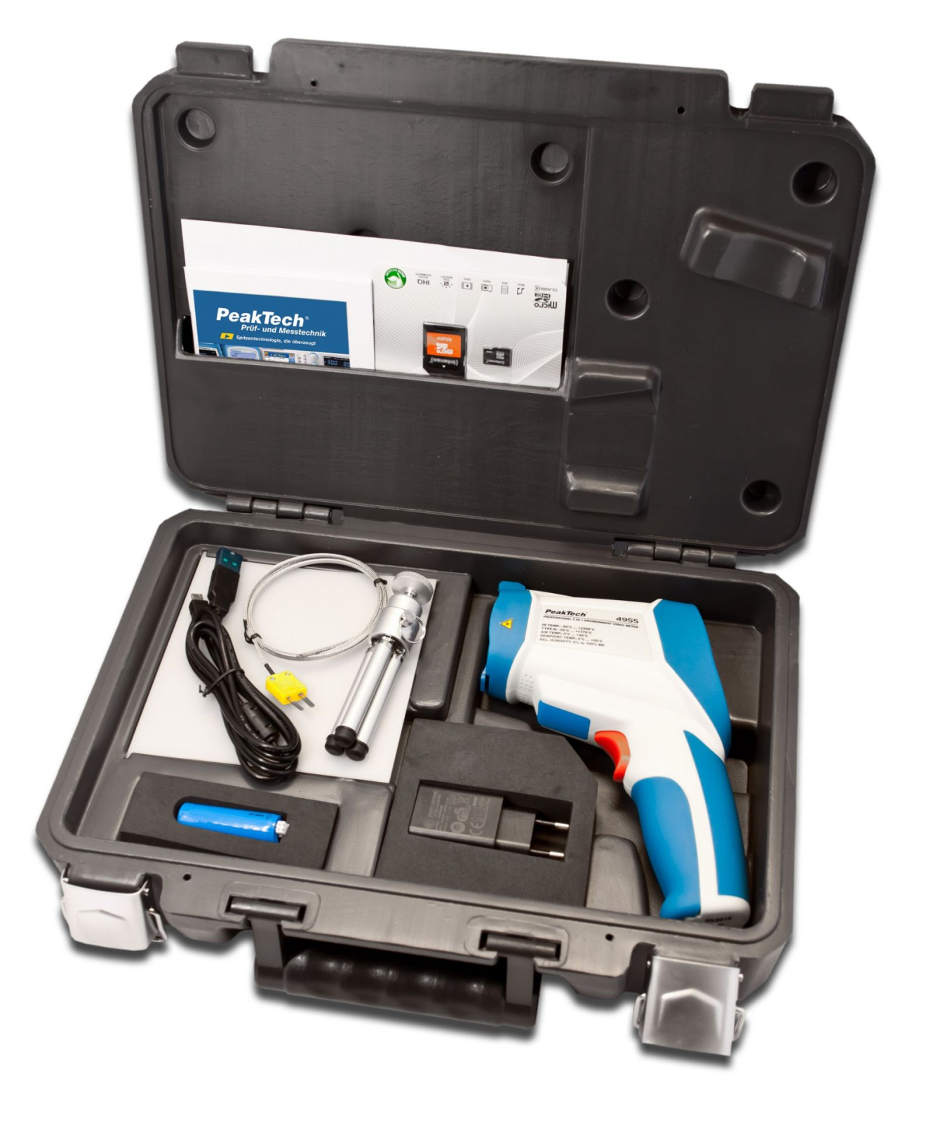 Livrat impreuna cu carcasă, termocuplu tip K, card de memorie microSD 2GB, sursă de alimentare AC 230V, suport, cablu USB, manual de utilizare, acest echipament oferă performanță fiabilă, testarea echipamentelor termice, verificarea instalațiilor HVAC si de control ambiental al aerului respirat.! ✅